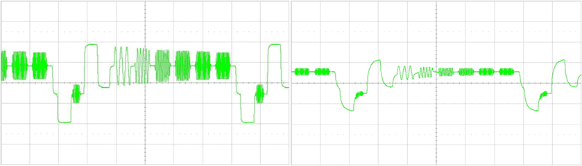 Note the totally deformed sync pulse and the greater video signal attenuation at copper-plated steel core cable.