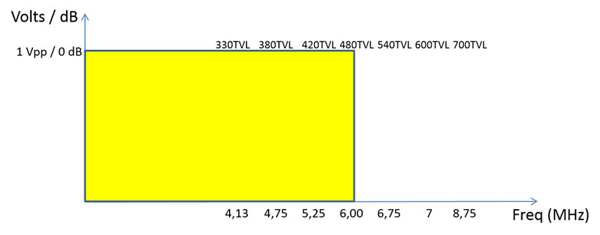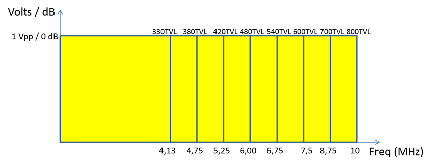 For example, for a 420 HTVL camera it is necessary a 5.25 MHz bandwidth; for 600 HTVL , 7.5 MHz .