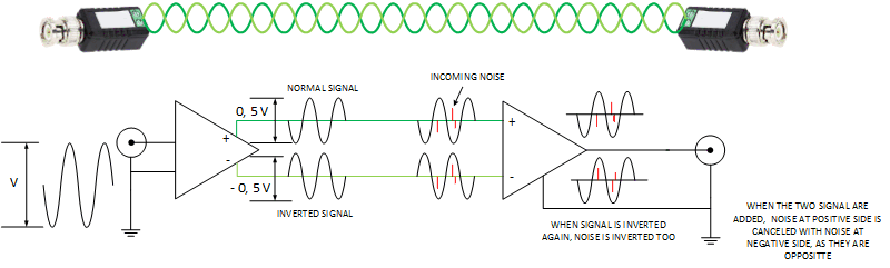 As the negative half of the noise is also inverted with the video signal, when the two halves of the signal are added, noise is canceled.