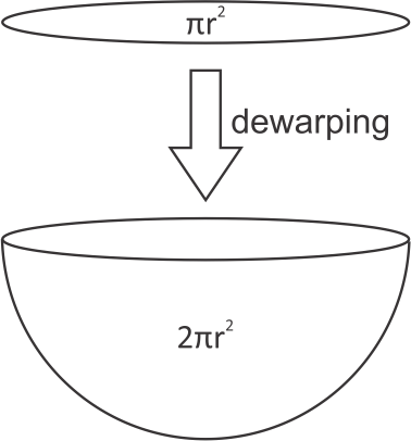 In this processing, the area in which a circle (πr2) is transformed into the area of a hemisphere (2πr2), maintaining the same number of pixels, resolution is halved since area doubles.
