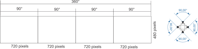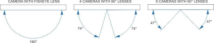 Please have in mind that this arrangement of cameras does not cover the same area of fisheye cameras, that provide 180 ° of tilt; lenses that cover 90° horizontally can cover only 74° vertically and lenses that cover 60° horizontally can cover only 47 ° vertically.