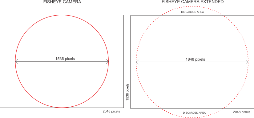 As the table below, for the fish-eye camera, we have a picking only 8.87% of the sensor area with 610 x 457 pixels, lower than a D1 resolution image. As for the extended fish-eye, we have an image covering 12.83% of the sensor area with 734 x 550 pixels, only 17% higher than D1 resolution.