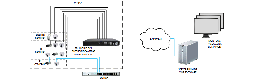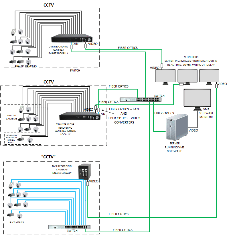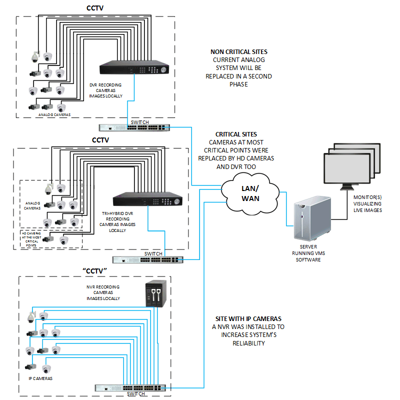 - The system within the hatched area is analog, with cameras connected directly to a local DVR, preserving the concept of a CCTV system as images are been recorded 24/7, in a frame rate and resolution according to customer's needs, totally independent of local network performance or bandwidth limitation;